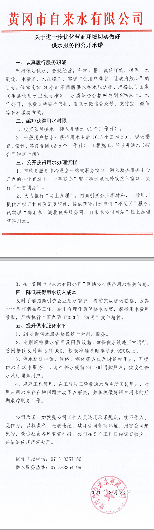 關(guān)于進一步優(yōu)化營商環(huán)境切實做好供水服務(wù)的公開承諾