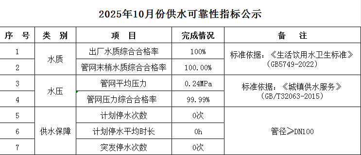 2025年10月份供水可靠性指標(biāo)公示